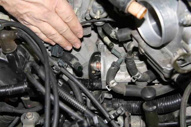 * Dismantle the two bolts holding the thermostat housing , towards the engine block. Big time PITA warning! They are placed behind two wiring harnesses on a bracket and a bracket holding the tranny shifter wire. The two bolts holding these brackets faces downwards, into the tranny. Refitting is even worse; I spent 3 hours and then my hands looked like I picked a fight with someone...